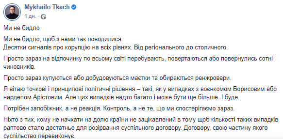 "Мы не быдло, чтобы с нами так обращались. Десятки сигналов о коррупции на всех уровнях. От регионального до столичного. Просто сейчас на отдыхе по всему миру находятся, возвращаются или вернулись сотни чиновников. Просто сейчас покупаются или достраиваются имения и покупаются ренжроверы", — написал журналист в сообщении в Facebook.