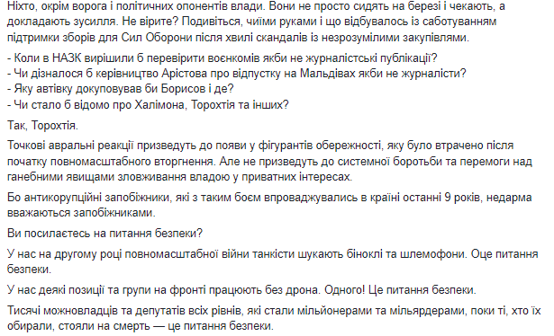 "У нас на втором году полномасштабной войны танкисты ищут бинокли и шлемофоны. Вот вопросы безопасности. У нас некоторые позиции и группы на фронте работают без дрона. Одного! Это вопрос безопасности. Тысячи власть имущих и депутатов всех уровней, которые стали миллионерами и миллиардерами, пока те, кто их выбирали, стояли насмерть — это вопрос безопасности", — отметил Ткач.