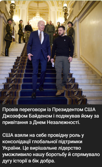 "США взяли на себе провідну роль у консолідації глобальної підтримки України. Це вирішальне лідерство уможливило нашу боротьбу й спрямувало дугу історії в бік добра", — написав глава держави.